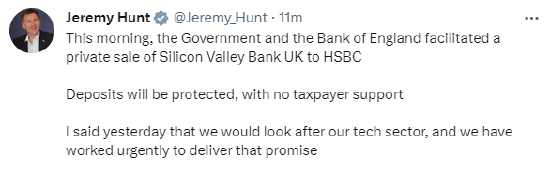 英国财政大臣杰里米·亨特(Jeremy Hunt)发推文称:“政府今早和英格兰银行促成了硅谷银行英国子公司出售给汇丰银行的交易,纳税人不会为此(硅谷银行倒闭事件)买单。”亨特表示:“我昨天说不会不管科技行业,也在紧急兑现承诺”。
