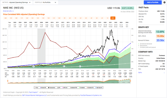 耐克的市盈率(市盈率)并不是特别有吸引力,如果使用2023年的盈利预期,市盈率大约为37倍。然而,投资者似乎相信耐克的管理和适应挑战的能力。尽管2023年耐克的业绩可能会下降,但基于其强劲的业绩记录、品牌认知度和创新能力,投资者继续给予耐克显著的溢价。