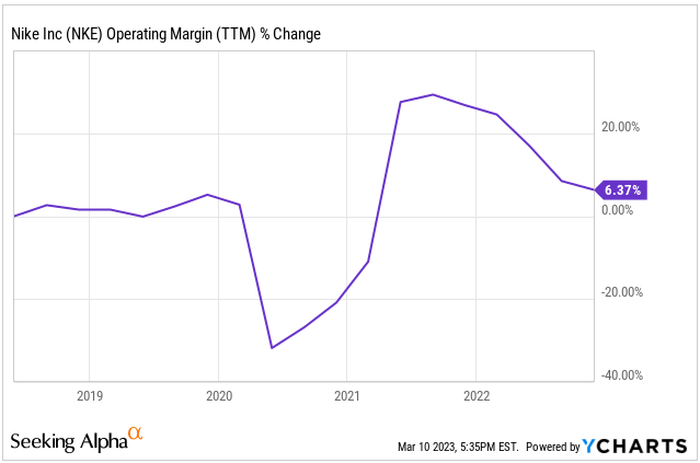 最后,耐克的高库存水平可能会给投资者带来风险。过多的库存水平会导致成本增加和利润压力。目前,耐克的库存价值近100亿美元。上个季度是疫情以来库存首次下降。尽管如此,耐克的库存仍然很高,如果对耐克产品的需求没有达到预期,该公司将被迫降价以转移库存,这可能会影响利润率。目前,由于批发商的高需求,耐克应对了高库存水平,但需求疲软可能会迫使折扣。