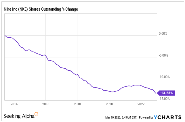 除了分红,公司还经常通过股票回购向股东返还资本。耐克的派息率仅为34%,有回购的空间,当股价具有吸引力时,可以有效地将价值返还给股东。然而,由于耐克目前的股价很高,激进的回购可能没有意义。尽管如此,耐克在过去几年一直在回购股票,导致流通股减少了13%。这种方法使股东受益,因为它增加了公司的所有权股份,同时提高了每股收益。