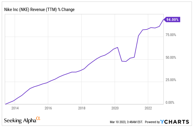 在过去的十年里,耐克经历了显著的收入增长,增长了94%。这一增长主要是由新市场的有机扩张、新产品的推出和价格的提高所推动的。耐克一直致力于扩大其全球足迹,在华和欧洲等关键市场建立了强大的影响力。该公司还在产品供应方面进行了创新,推出了耐克Flyknit和耐克React等新系列,客户都很满意。