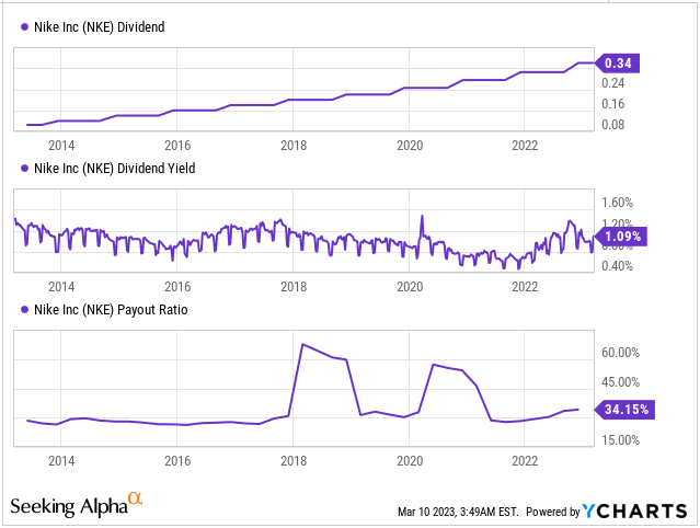 耐克在过去十年中表现出了令人印象深刻的收入和每股收益增长,这要归功于它专注于开拓新市场、推出新产品、减少份额和提高利润率。该公司以股息持续大幅增长而闻名,可持续的派息率为进一步增长留下了空间。股票回购也是向股东返还资本的一贯手段。虽然目前的市盈率可能不太吸引人,但在我看来,投资者似乎相信耐克的管理和战略举措。
