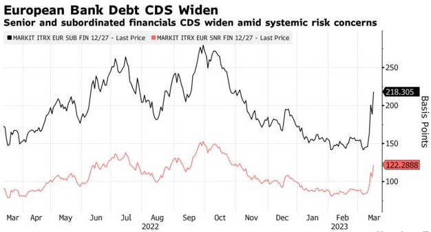 与此同时,由于对瑞信问题蔓延风险的担忧加剧,欧洲金融业违约保险成本持续飙升。欧洲金融机构CDS价格上升表明,投资者正对银行和其他金融机构违约和评级下调的可能性感到担忧。这可能导致更加厌恶风险的投资环境,在欧洲央行收紧货币政策以抗击通胀之际,这反过来可能限制信贷的可获得性,并减缓经济增长。