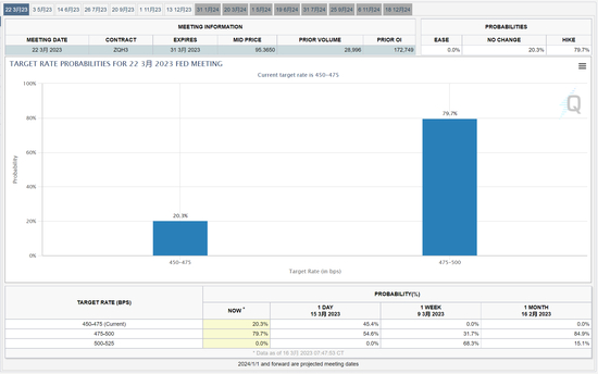 CME美联储观察工具显示,市场大幅提高了美联储下次政策会议加息力度较弱、甚至暂停加息的可能性,投资者预计美联储加息25个基点的可能性为79.7%,暂停加息的可能性为20.3%。