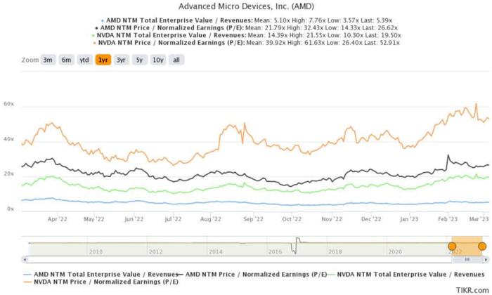 AMD 仅从 2022 年 10 月的底部反弹了 45.08%,而标准普尔 500 指数为 12.9%,英伟达(NASDAQ:NVDA)为 109.76%。这可能归因于围绕 ChatGPT 的炒作,它已经在英伟达的 A100 GPU 上进行了训练,特别是在后者从 GPU 销售有希望的早期复苏中获得财务复苏的顺风帮助下。