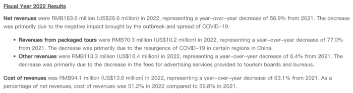 2023年3月17日,途牛披露了2022年全年及Q4财报,2022年,途牛营收为1.84亿元,同比下跌56.9%;净亏损为2.03亿元,上年同期净亏损为1.29亿元。