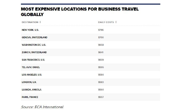 ECA的调查根据各国短途旅行的费用进行排名,包括四星级酒店房间、用餐、洗衣、酒精和软饮料、出租车旅行和杂费等成本。