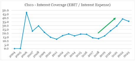 在过去10年里,思科还减少了债务负担,其利息覆盖率目前处于非常健康的水平。
