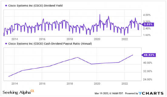 开始季度分红是一项重大发展,为股东提供了稳定和不断增长的被动收入。目前,CSCO 3.1%的远期股息率(请注意,下图中的股息率不包括最近的增长)接近过去10年的高端水平。