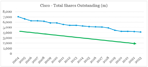 最后但并非最不重要的是,思科多年来一直回购股票,因此自2004年以来,总流通股减少了近45%。