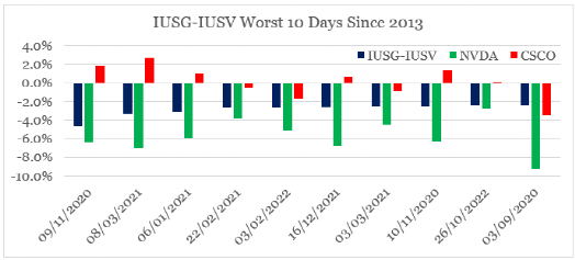 在下面的图表中,可以看到自2013年以来ISUG-IUSV指数最差的10个日子,以及上面提到的两家公司在这些日子里的表现。