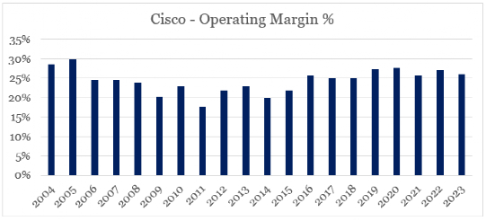 尽管在过去20年里,思科的销售复合年增长率为个位数左右,但它一直保持着盈利能力,目前是业内盈利能力最高的公司之一。