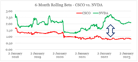 从另一个角度来看,标普500指数的贝塔系数也显示了投资者持有高成长股的巨大风险。随着2022年股市整体下跌,思科的贝塔值实际上下降了,而英伟达的贝塔值则出现了大幅上升。