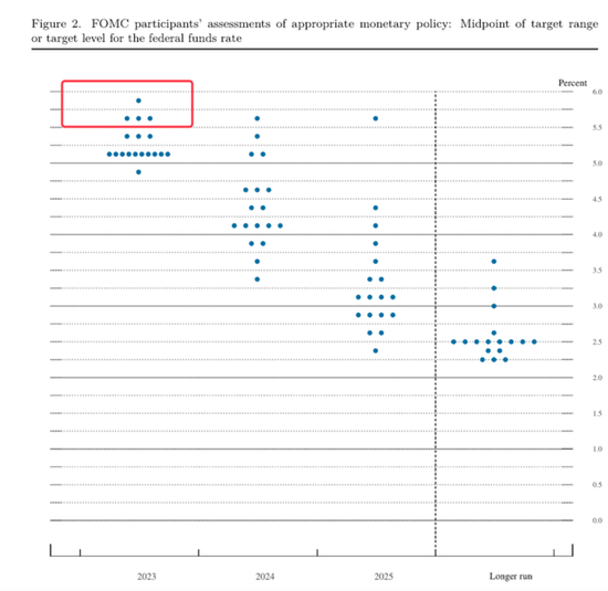 点阵图还显示,另外有两位官员与Bullard的预测相同,预计2023年美国峰值利率可达5.625%,还有一位官员的预估更高,给出了5.875%的峰值。