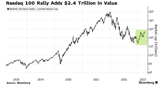 今年到目前为止,纳斯达克100指数的涨幅使得该指数市值增加了超过2.4万亿美元,总市值达到约15.5万亿美元,接近2021年底近20万亿美元的峰值。