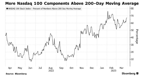 今年到目前为止,个股出现了广泛上涨,纳斯达克100指数股票中只有少数出现了两位数比例的跌幅。这使得技术面情况得到优化。目前,该指数约2/3的成分股股价处于200日移动均线上方。相比之下,去年9月下旬,只有不到8%的成分股股价高于200日移动均线。