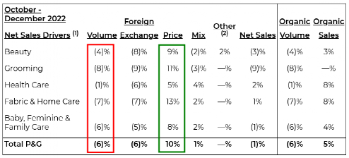 在最新的第二季度报告中,宝洁报告有机销售额总体增长 5%,其中美容、保健、织物和家庭护理以及婴儿、女性和家庭护理领域均出现增长。销售额净增长为负 (1%),受汇率影响 (6%)。