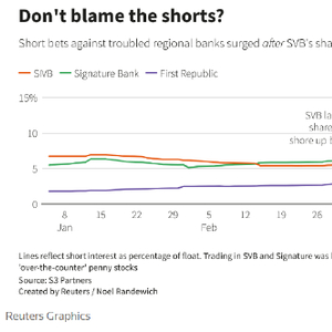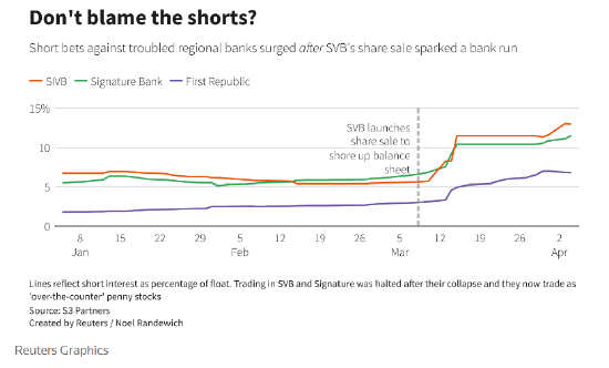 但三家机构的数据显示,到了3月,空头头寸开始集体增加,只是各家公司的指标显示的强度有所不同而已。第一共和银行的融券比例在上月达到7%至39%的峰值,硅谷银行峰值为11%至19%,签名银行为6%至11%。