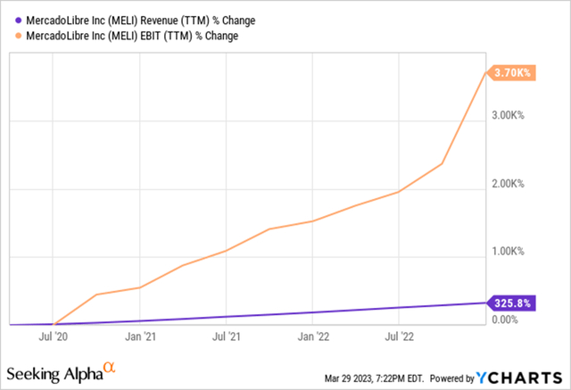 MercadoLibre 新业务部门的一个共同点是利用其现有的 MercadoLibre 用户群。它通过向商家提供支付服务和信贷扩展到金融科技领域,从而催生了其他金融科技产品。以类似的方式处理履行和广告技术。每一项都突出了管理层的战略和资本配置技能。公司Q4成绩单中, CFO Pedro Arnt 描述了MercadoLibre针对业务部门的战略流程。他们的目标是增加年度息税前利润,同时对有吸引力的业务线进行有计划的投资。通常,一项新业务一开始是无利可图的,但随着时间的推移会产生更强劲的利润。然而,该公司的整体息税前利润能够从商业和金融科技等更成熟的领域继续增长。自 2020 年年中以来,这种经过计算的方法似乎正在取得回报,息税前利润增长远远超过收入增长。