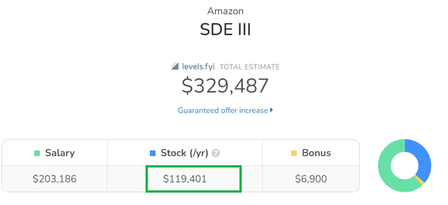 像Levels.Fyi这样的网站的激增为公众和投资者提供了一个合理可靠的洞察力,了解他们感兴趣或投资的公司的薪酬待遇。下图显示,典型的高级软件开发工程师("6级")每年获得约12万美元的股票补助。根据目前的市场价格,这大约是1,200股。显然,零售业员工的工资不像大多数企业员工那样高,我并不是说普通员工每年得到1200股。但反过来说,随着我们从L6到L10的阶梯上升,报酬更偏向于RSU(记住,亚马逊的基本上限仍然是有上限的,尽管从2022年2月起上限更高)。
