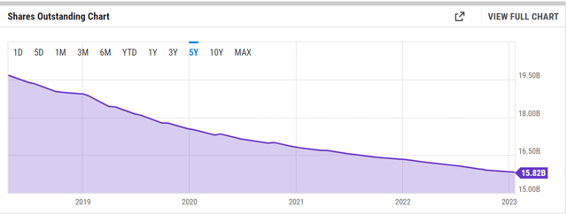 由于其回购计划, 苹果在同一五年期间已将其流通股减少了近 20%。