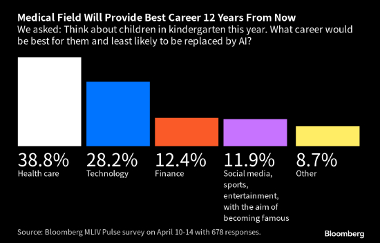 对于今年要从幼儿园毕业的孩子们,投资者的建议则有所不同。近40%的受访者认为,医疗行业是最佳选择。医疗领域的工作往往会涉及诸多人与人之间的互动,AI可能永远都无法完全取代。