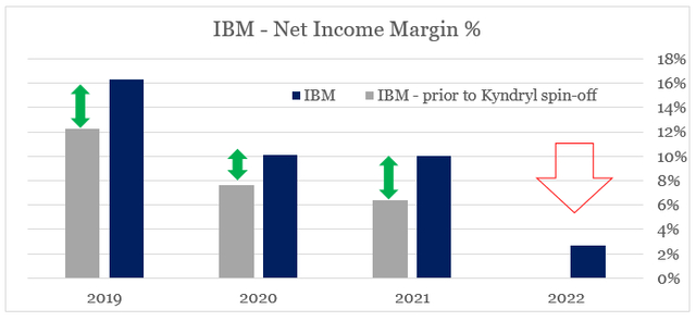下图清楚地说明了这一点,我们看到IBM在分拆Kyndryl之前和之后的净利润率存在巨大差异。