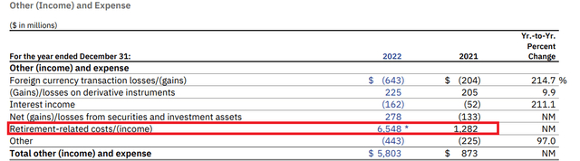 同时也不能错过2022年盈利能力的大幅下降,这主要是由于59亿美元的养老金结算费用,根据管理层的说法,这应该是一次性项目。