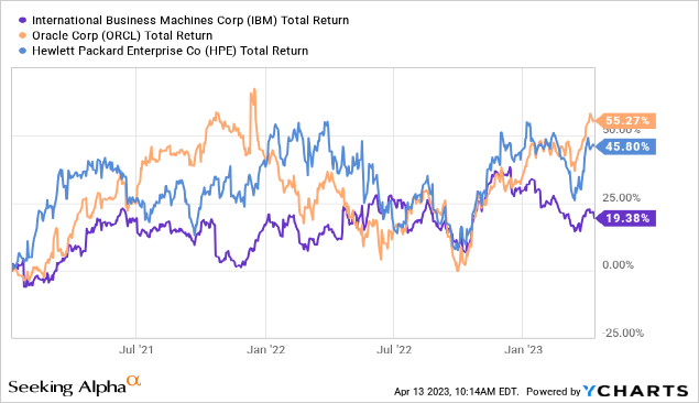 然而,在同一时期,惠普(NYSE:HPQ)和甲骨文(NYSE:ORCL)的表现明显优于IBM,回报率分别为46%和55%。