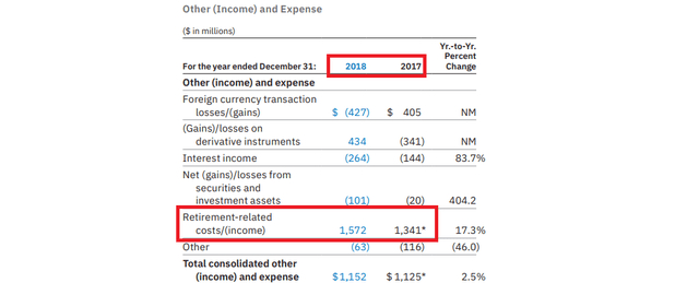 但实际上,IBM在2021年经历了13亿美元的退休相关成本,并在2018年和2017年经历了类似的支出。