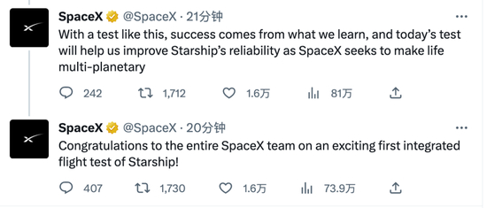 而且 SpaceX 仍然祝贺整个团队完成了激动人心的 Starship 首次综合飞行测试。