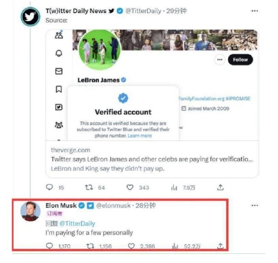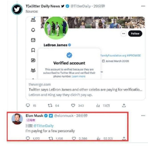 推特开始取消不付费账号的认证标志,马斯克自掏腰包为几位名人付费