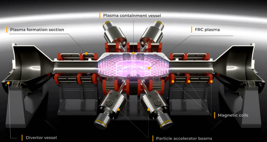 TAE正在研究让氢与硼发生核聚变反应来发电,为此,公司开发了场反转配置技术实现对核聚变等离子体的高温稳定控制。
