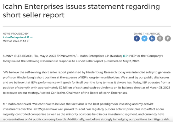 伊坎在一份声明中表示,兴登堡“自以为是”的报告旨在以牺牲IEP长期股东的利益为代价获取利润。伊坎表示:“我们坚持公开披露的信息,我们相信,从长期来看,IEP的业绩将会像以往一样不言自明。”