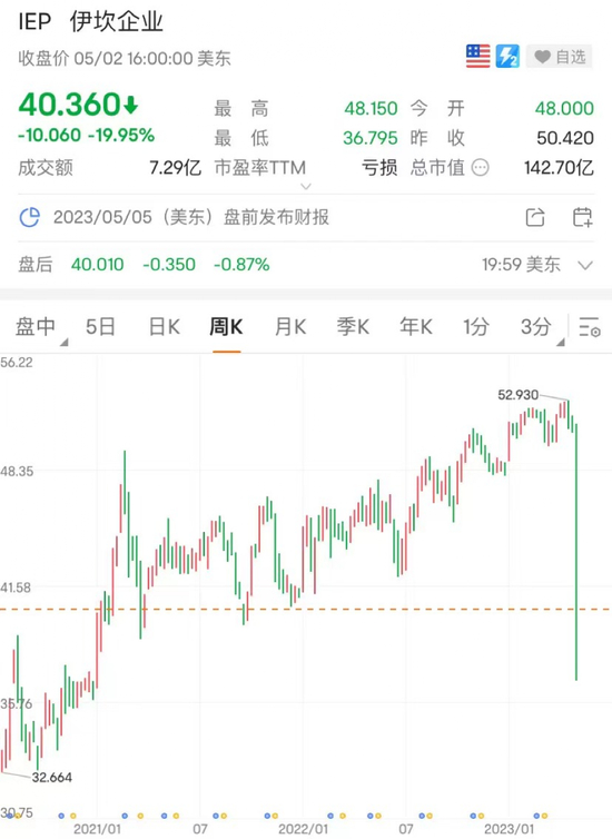 报告一出,伊坎旗下控股公司伊坎企业Icahn Enterprises LP,IEP)股价美东时间5月2日周二收盘暴跌19.95%,创有史以来最大单日跌幅,市值蒸发40多亿美元。