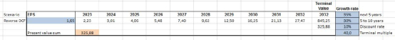 看看反向DCF,再看看股价的增长率是多少,我们可以看到股票在未来五年的每股收益增长率为35%,未来五年的增长率为30%。