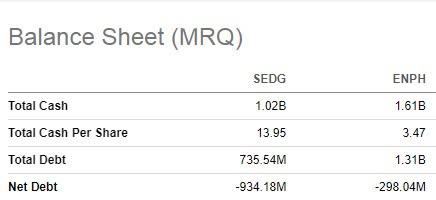 两家公司的资产负债表都非常强劲,拥有大量现金和债务,可以轻松偿还。在杠杆FCF [TTM]方面,SolarEdge在205.70至149.30略有优势。因此,两家公司都有足够的现金为其增长提供资金,并可能在未来通过回购或股息将现金返还给他们来奖励股东。