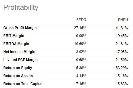 在EV/EBIT等传统指标上,如果我们不针对潜在的未来进行调整,SolarEdge看起来被高估了。但如果你考虑到高增长率,事情看起来要合理得多。现在的问题是,SolarEdge或Enphase是这个行业更好的长期投资。