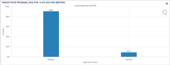 市场对于美联储6月不加息的概率下降到了90.9%,而对于6月加息的预期上升到了9.1%,降息25个基点的概率为0%。