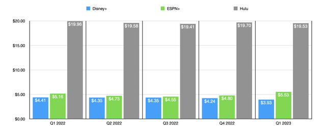 投资者还应关注迪士尼提供的其他流媒体服务。这些是 ESPN+ 和 Hulu。正如您在提供的数据中看到的那样,这两者都在继续增长,尽管它们的增长远低于 Disney+ 多年来的增长。然而,与 Disney+ 不同的是,它们的定价基本稳定。事实上,在最近几个季度,ESPN+ 经历了一个普遍的上升趋势,以及每个用户每月产生的收入。尽管我认为可能性不大,但投资者应留意有关可能出售 Hulu 的任何讨论。有这方面的谣言,但没有足够具体的证据表明它会成为现实。