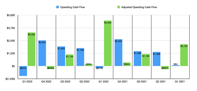 正如在下图中所看到的,今年第一季度出现了相当可观的经营现金流出。但如果我们根据营运资金的变化进行调整,该公司的净流入为 33 亿美元。这实际上是该公司产生的最高收入,仅次于一年前报告的 44.6 亿美元。但是,在这方面看到同比下降仍然不是一件好事。