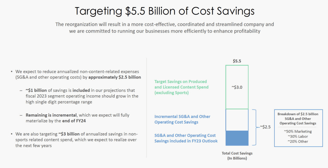 在这 25 亿美元中,50% 将用于营销,而 30% 将用于劳动力。公司已经裁员其名册中约有 4,000 名员工。他们的最终目标是将这个数字增加到大约 7,000。在这 25 亿美元的成本削减中,另外 20% 将来自其他杂项运营来源。管理层确实表示,预计这些成本削减举措中约有 10 亿美元将出现在公司 2023 年部门营业收入以高个位数百分比增长的预测中。如果这一切真的实现了,它肯定会出现在现金流中。