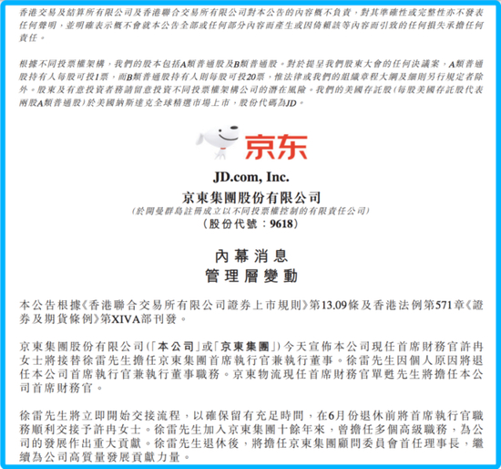 在发布的管理层变动公告中,京东集团写到“徐雷先生将立即开始交接流程,以确保留有充足时间,在6月份退休前将首席执行官职务顺利交接予许冉女士”。