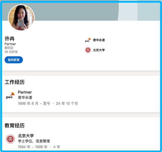 根据公开资料,许冉于1994年考入北京大学,攻读信息管理专业,获得了理学与经济学双学士学位。毕业后进入普华永道,在北京办事处及圣何塞办事处工作近20年,专注TMT行业及美国资本市场,直至成为普华永道中天会计师事务所(特殊普通合伙)审校合伙人。