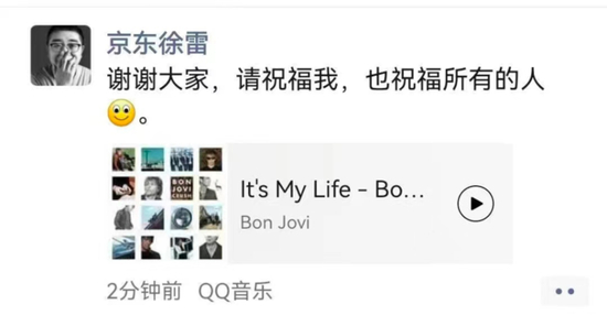 徐雷在朋友圈回应:“谢谢大家,请祝福我,也祝福所有的人(微笑)。”并配了美国摇滚乐团Bon Jovi的歌曲《It’s My Life》。
