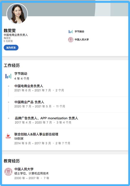 公开资料显示,魏雯雯于2000年考入中国人民大学,七年后从该校计算机应用技术专业毕业,获得硕士学位。在百度、58到家等企业工作几年后,魏雯雯于2017年加入字节跳动,负责今曰头条、巨量引擎等产品的广告和商业化相关业务,直至2021年晋升为抖音电商总裁,负责中国区业务。
