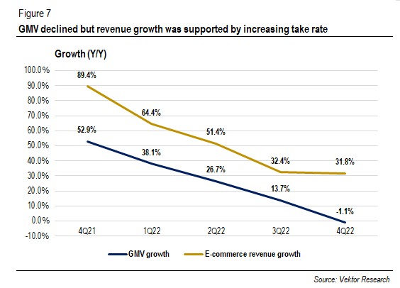 尽管如此,按固定汇率计算,总订单下降 15% (Y/Y),GMV 增长从 22 年第三季度的 21% (Y/Y) 放缓至 22 年第四季度的 8% (Y/Y)。报告的 GMV 下降 1.1% (Y/Y)。