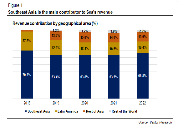 总体而言,Sea Limited拥有三个业务部门:Garena,数字娱乐业务;电子商务平台Shopee;SeaMoney 旗下的数字金融服务提供商。截至 2022 年,Shopee 贡献了Sea Limited近 60% 的收入。