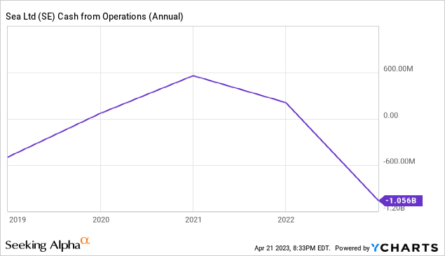 此外,Sea 去年的电子商务收入为 73 亿美元,低于当时88 亿美元的全年指导(中点),后来由于转向“关注长期效率和优化”而被取消电子商务业务的实力和盈利能力。”反过来,加息支持了Sea Limited的电子商务收入增长。去年的经营现金流为负 11 亿美元(- 18 亿美元减去基于股票的薪酬)。