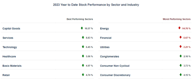 任何关注市场的人都知道,石油公司在过去一年的表现落后于市场。从2023年初至今,能源是表现最差的行业,在不到五个月的时间里下跌了14%以上。即使在硅谷银行和瑞士信贷的灾难之后,金融股看起来也比能源股好。
